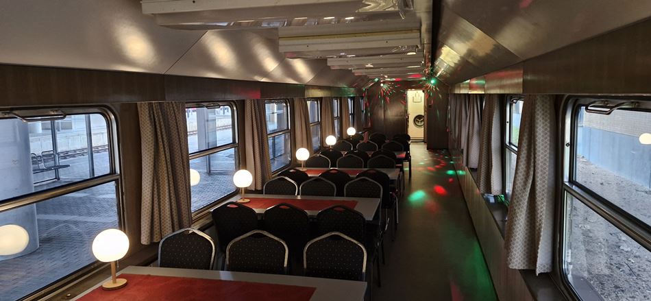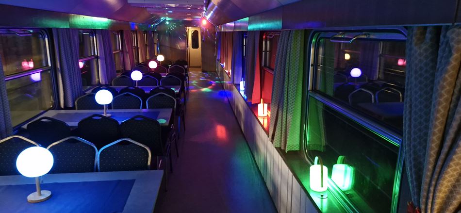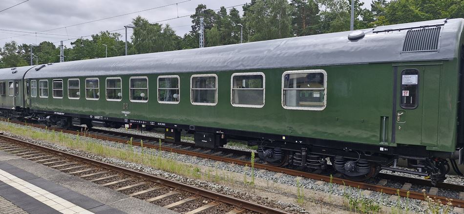 Er ist unser „Neuer“ im betriebsfähigen Fahrzeugpark der WFL. 1975 im VEB Waggonbau Bautzen erbaut, gehörte zum Regierungszug der DDR. Zur Vervollständigung der Versorgungsmöglichkeiten wurde er als Barwagen in den Fahrzeugpark der NVA integriert und verfügt über eine Kleinküche und eine Bar. Seine Inneneinrichtung ist variabel und verfügt im Grund über 30 Sitzplätze an 6 Tischen und einen Tanzbereich.